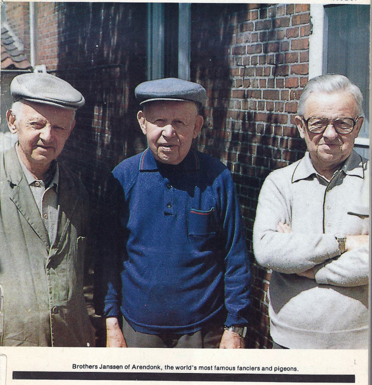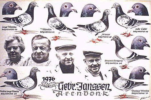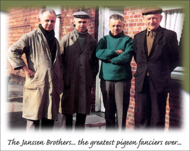 Janssen Brothers of Arendonk Belgium are "household words" in the international sport of racing pigeons. Henri Janssen (1872-1947) is the originator of the Janssen strain. Henri started with his first pigeons in 1886. He married Pauline and together they had 9 children; Fons, Frans, Jef, Vic, Irma, Adriaan, Charel, Marie and Louis. Henri was a star fancier and helped found the Arendonk pigeon club. The children were all very involved in pigeon keeping. After the death of their father the boys continued to race and win. The induction of key pigeons from the 60's-70's skyrocketed the brothers fame who became unbeatable when combined with their family line. These fanciers remained at the top of the sport for over half a century. Virtually every champion racing pigeon in the world today has some of their great racing pigeon blood running through them. In May 2012 Louis, the last of the brothers at 99 years old sold off the last of his beloved pigeons, marking the end of an era. Author: Ad Schaerlackens has written books about these famous fanciers.